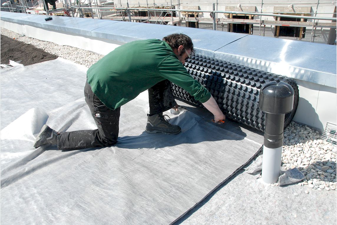 Für die Dachbegrünung wurde erstmals auf 585 m² die Speicher- und Drainagematte BMI Flor SD-V 25 der BMI Deutschland GmbH eingesetzt. Das System kombiniert Drainage- und Wasserspeicherfunktion mit integriertem Filtervlies und ermöglicht damit die Ausführung zweier Arbeitsschritte in einem. Die Matte ist 25 mm stark, besteht aus recyceltem HDPE und verfügt über eine Wasserspeicherkapazität von 11 Litern pro m². Sie ist für extensive Begrünungen bis zu einer Dachneigung von 5° geeignet.