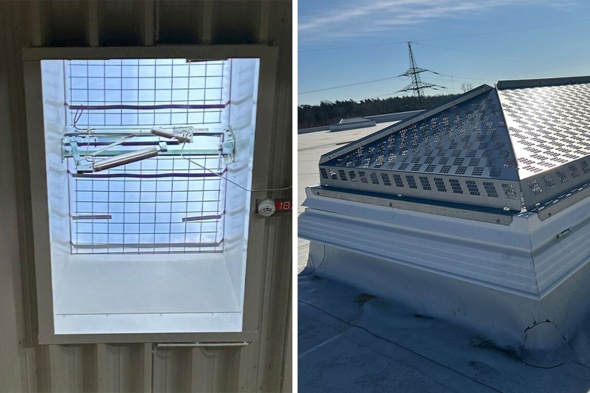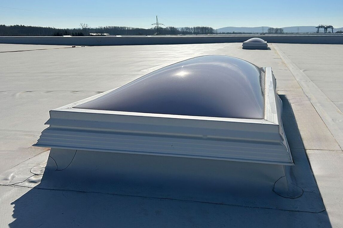 Kingspan Light + Air lieferte ein Komplettsystem: Für die Belichtung sorgen Kingspan Essmann LK classic 120/240 Lichtkuppeln mit wärmegedämmtem Metall-Aufsetzkranz. Ergänzt wurden diese durch Ab- und Durchsturzsicherungen (RSM) sowie das HDS-System zum Schutz gegen Hagel, gegen Durchsturz und gegen starke Sonneneinstrahlung. Rauch- und Wärmeabzugsgeräte (NRWG F6 LK) gewährleisten eine schnelle Entrauchung; Notauslösestationen NAS-P vervollständigen die sicherheitstechnische Infrastruktur.