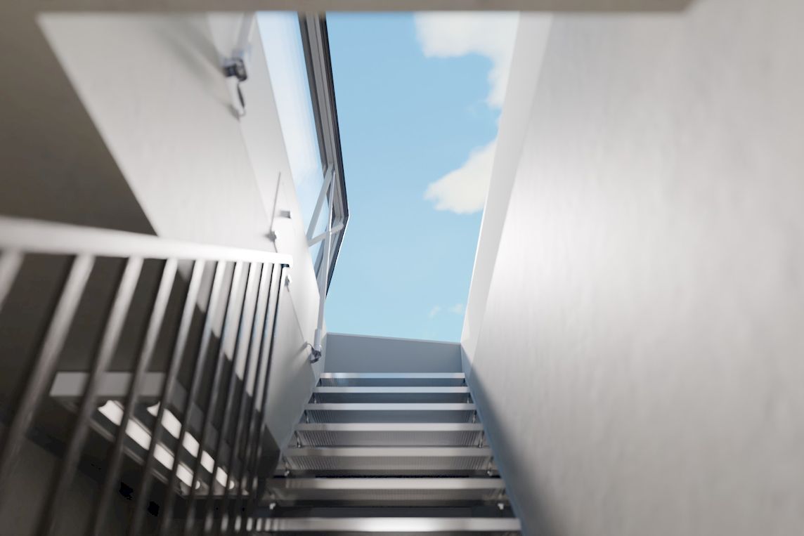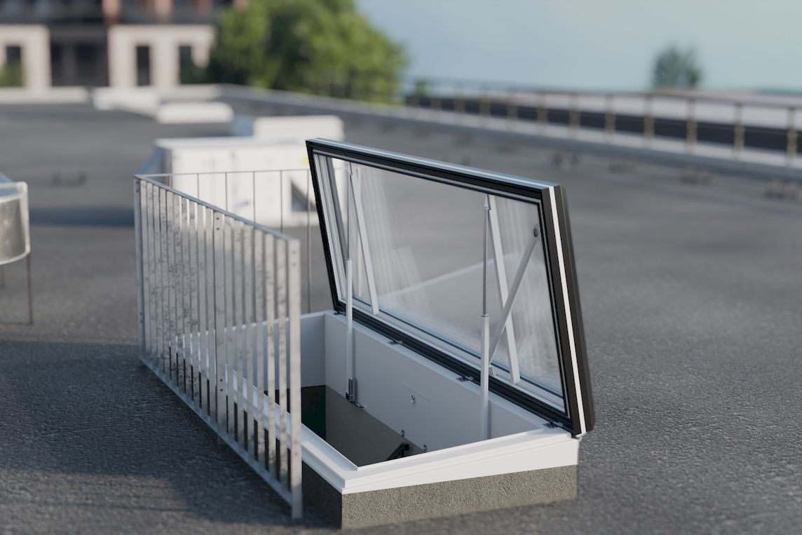 Das System verfügt über ein Format von bis zu 90 x 300 cm und eine Öffnung von 80°. Dadurch wird ein Übergang vom Gebäude auf das Dach mit vergrößerter Bewegungsfläche ermöglicht. In Verbindung mit einer bauseitigen geraden Treppe kann ein dauerhaft nutzbarer Zugang geschaffen werden. Ein integriertes Akkupaket stellt die Funktion auch bei Stromausfall sicher. Die maximale Öffnungsfläche beträgt bis zu 2,7 m², wodurch der Transport von Werkzeugen oder Bauteilen erleichtert wird.