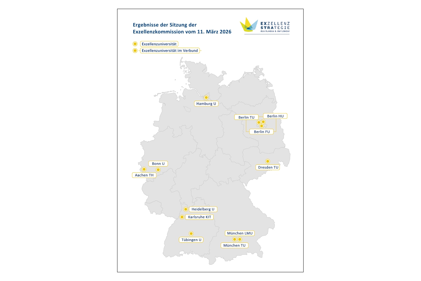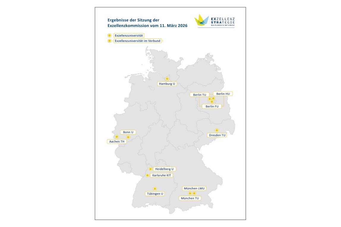 (12.3.2026) Am 11. März 2026 ist die Entscheidung im Evaluationsverfahren der Förderlinie Exzellenzuniversitäten der Exzellenzstrategie gefallen. Demnach werden ab 2027 insgesamt 10 Exzellenzstandorte für weitere 7 Jahre gefördert.