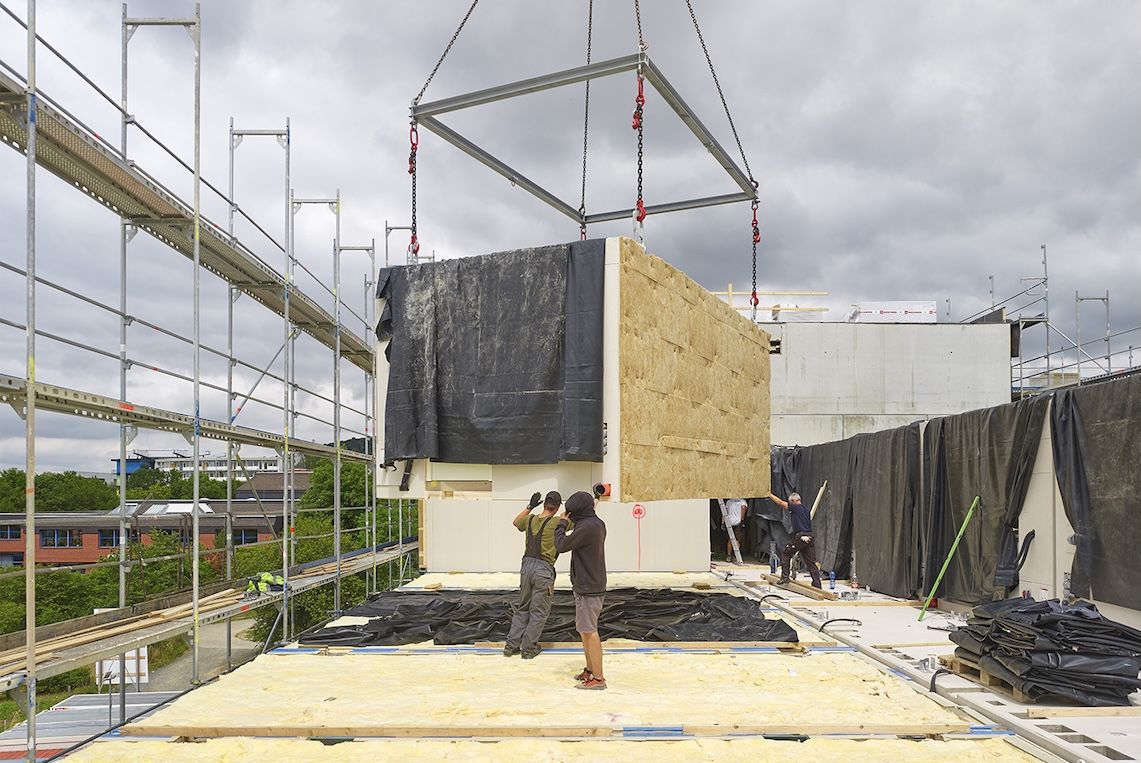 Die vier Obergeschosse basieren auf seriell gefertigten Raummodulen des österreichischen Herstellers Kaufmann Bausysteme GmbH. Die Module wurden mit hohem Vorfertigungsgrad produziert und an die Baustelle geliefert. Bauherr und Architekten entschieden sich aus ökologischen Gründen für eine Ausführung in Massivholz.
