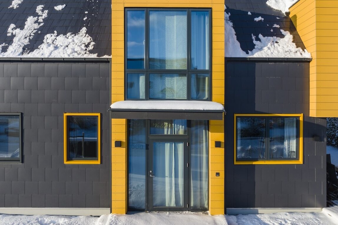 Gestalterische Akzente setzen die sonnengelben Rahmungen der geschosshohen Erker, Fenster und des Eingangs. Diese Bereiche wurden mit Equitone Fassadentafeln ausgeführt, die ebenfalls aus dem Hause Etex stammen. Die farblich abgesetzten Elemente kontrastieren deutlich mit der dunklen Faserzementhülle und strukturieren die Fassade.