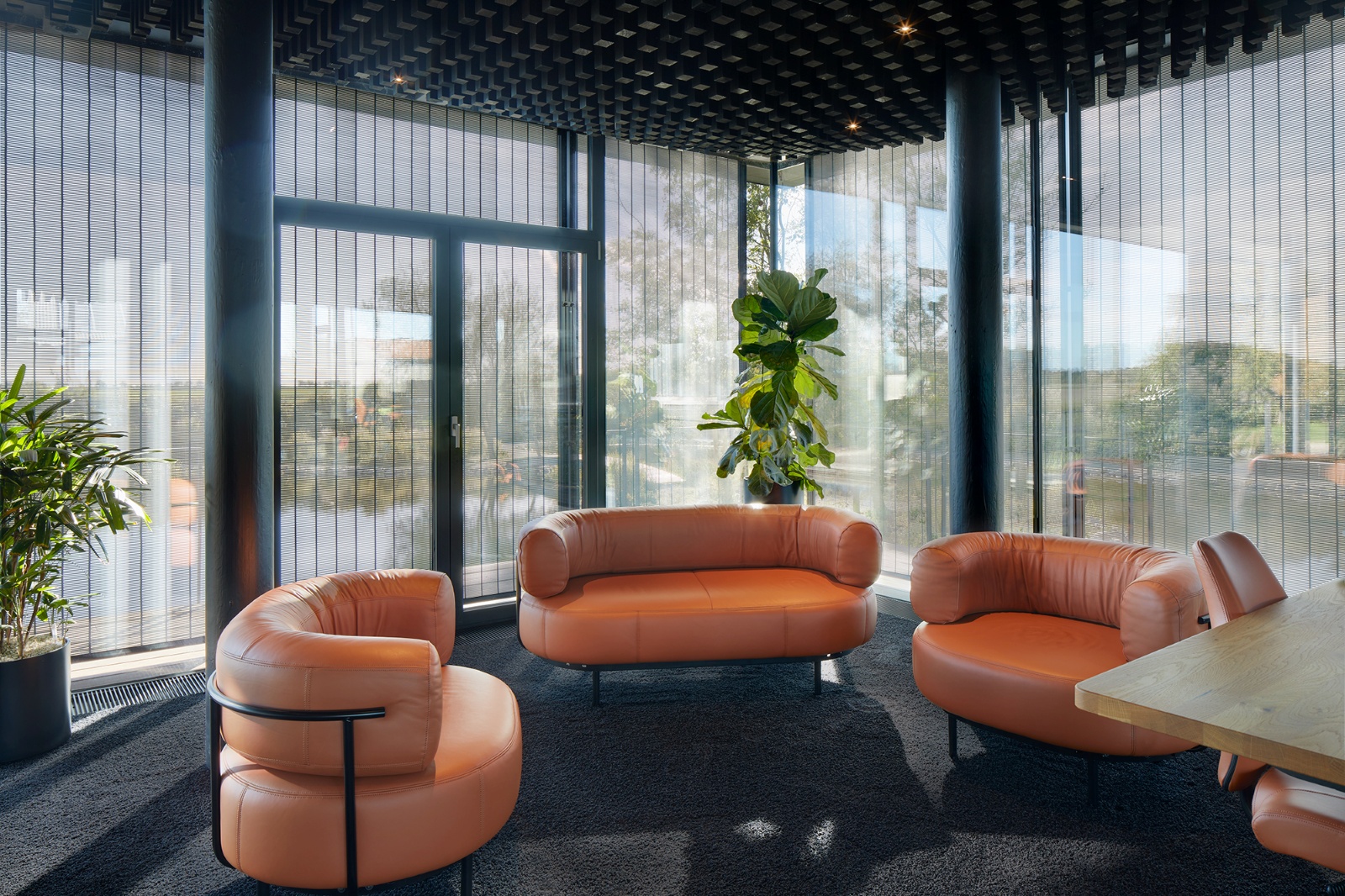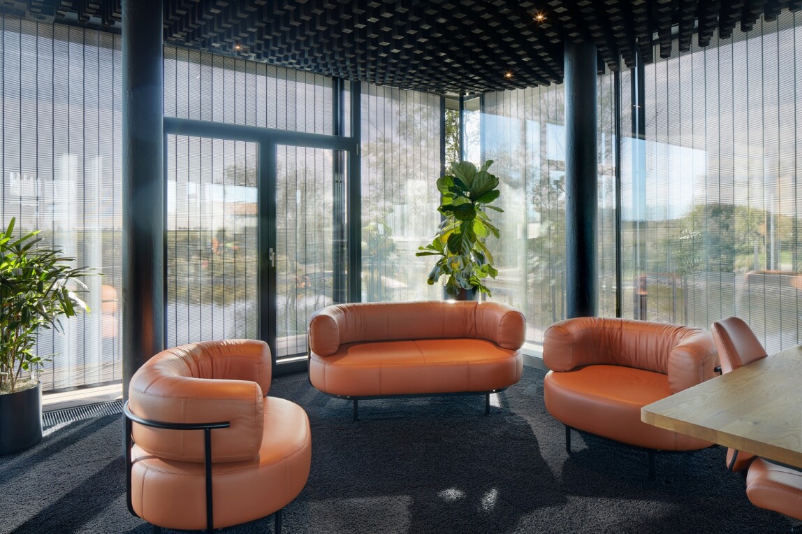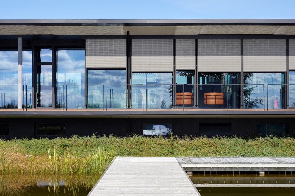 Wesentlichen Anteil an Lichtführung und thermischem Komfort hat der außenliegende Metallbehang s_enro von MHZ, einer der führenden Hersteller für Sicht-, Sonnen- und Insektenschutz aus Leinfelden-Echterdingen. Als bewegliches Sonnenschutzsystem konzipiert, prägt der Behang als gestalterisches Element die architektonische Identität des Gebäudes. Er gewährleistet einen zuverlässigen Sonnenschutz – selbst bei Windgeschwindigkeiten bis zu 18 m/s – und ermöglicht dennoch eine visuelle Offenheit nach außen. Besonders dann, wenn Sonne und starker Wind – wie es in der küstennahen Region öfter mal der Fall ist – gemeinsam auftreten, spielt das System von MHZ seine Stärken voll aus.