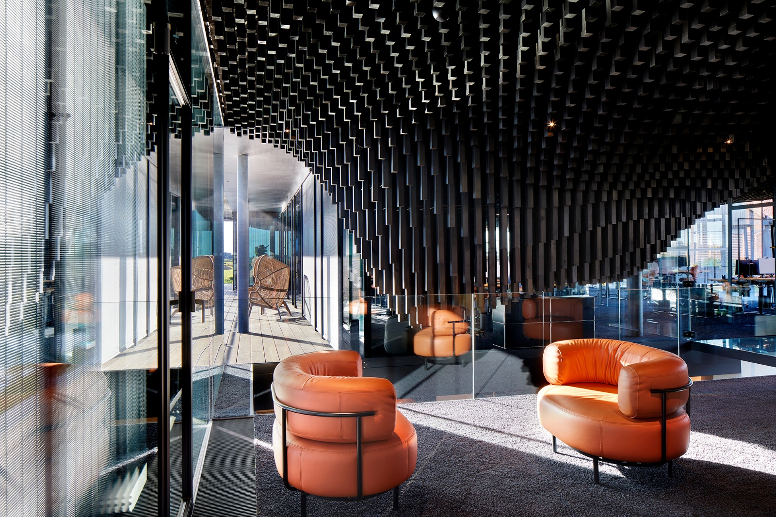 (Advertorial 23.3.2026) Auf einem historischen Gutshof entstand ein Arbeitsumfeld, das Ästhetik, Funktion und Komfort gekonnt vereint. Besonders prägend: eine parametrisch entwickelte Akustikdecke, die dem Raum eine charakteristische Atmosphäre verleiht. Der außenliegende Metallbehang s_enro der MHZ Hachtel GmbH & Co. KG wirkt positiv auf den Komfort sowie auf das Innenraumklima und ergänzt das energetische Konzept. So entsteht nicht nur ein funktionaler Ort des Arbeitens, sondern ein lebendiger Raum, der Potenziale entfaltet – architektonisch bis ins kleinste Detail durchdacht und konsequent im Ausdruck.