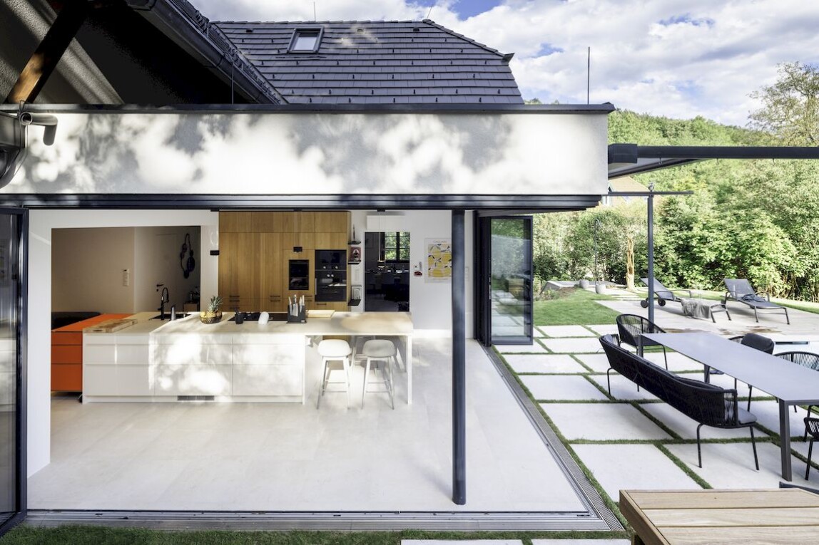Im Mittelpunkt steht ein großzügiger, barrierefreier Wohnbereich, der als zentraler Aufenthaltsraum dient. Für dessen Realisierung wurde ein bestehender Anbau zurückgebaut und durch einen Neubau ersetzt. Die Verbindung zur Terrasse erfolgt über eine großflächig öffenbare Glasfassade. „Der Bauherr wünschte sich, dass hier alles zusammenkommt: Kochen, Spielen, Arbeiten und Feiern”, erläutert Architekt Birk Stauber.
