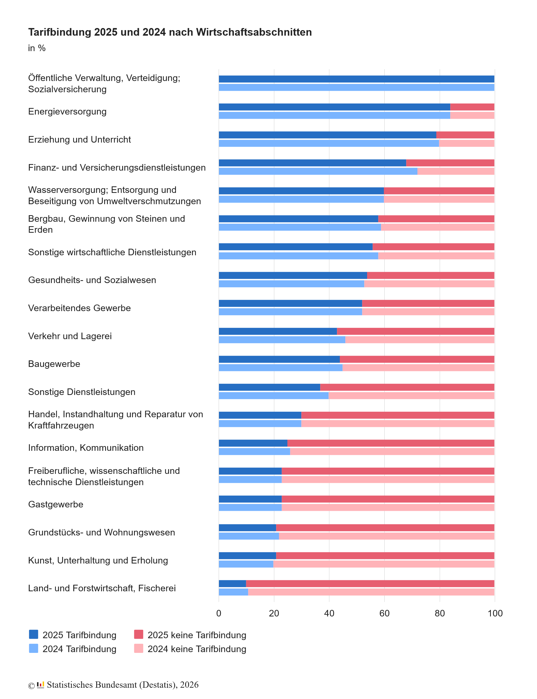 (20.3.2026) Wie das Statistische Bundesamt mitteilt, bestanden 2025 in Deutschland weiterhin deutliche Unterschiede in der Tarifbindung zwischen den einzelnen Branchen. Knapp 49% aller Beschäftigten in Deutschland waren im Jahr 2025 in einem tarifgebundenen Betrieb beschäftigt. Somit blieb die Tarifbindung im Vergleich zu den Vorjahren konstant. Die Tarifbindung weist den Anteil der Beschäftigten in einem tarifgebundenen Betrieb an allen Beschäftigten aus.