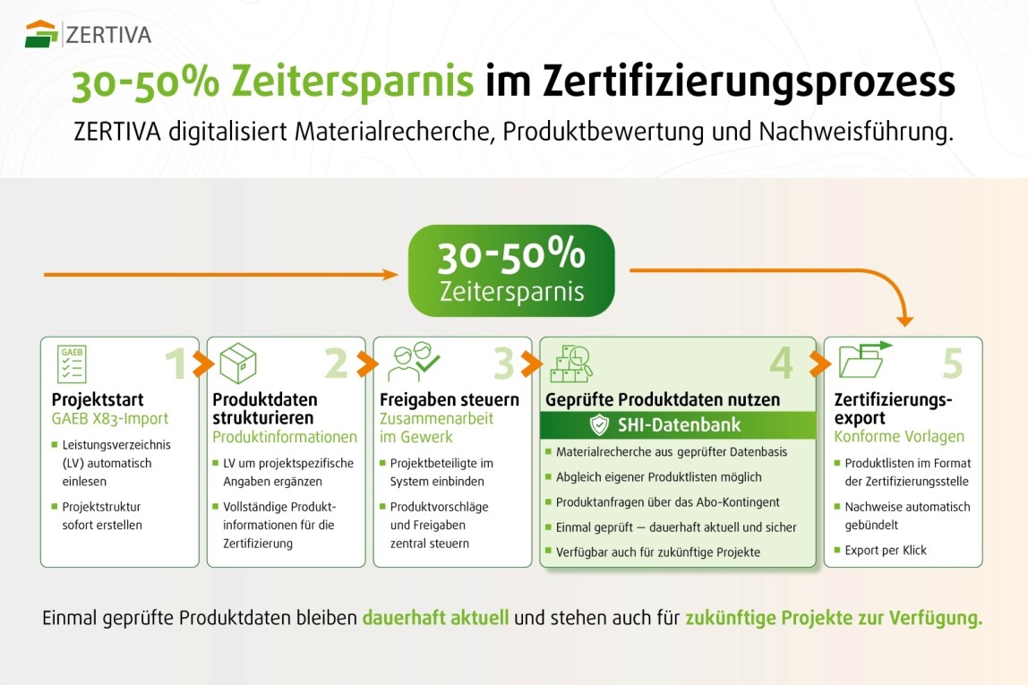 Zertiva bringt geprüfte Daten, intelligente Analysefunktionen und strukturierte Nachweisführung in einem durchgängigen Prozess zusammen. Somit sollen Aufwand, Unsicherheit und Medienbrüche reduziert und deutlich mehr Planungssicherheit über alle Projektphasen hinweg geschaffen werden. Mit Zertiva steht ein lösungsorientiertes Werkzeug zur Verfügung, das relevante Gebäudezertifizierungssysteme berücksichtigt. So lassen sich Bauprojekte nach QNG, DGNB, BREEAM, LEED, EU-Taxonomie, BNB oder schadstoffgeprüften Standards umsetzen.