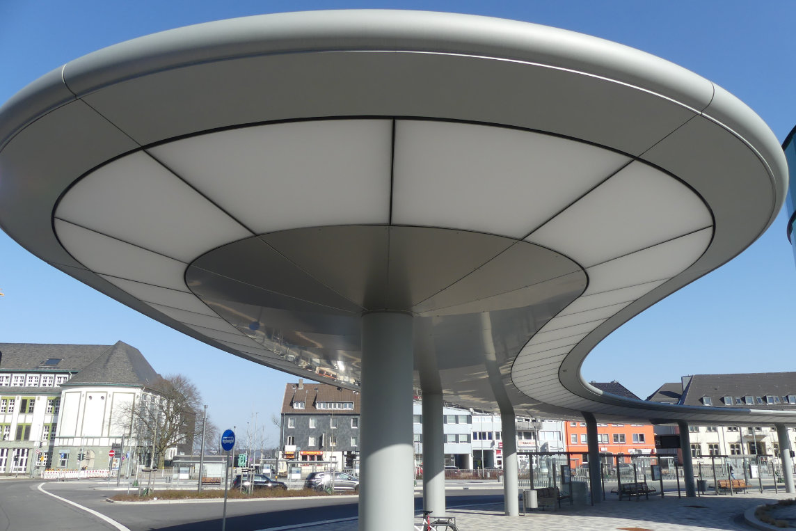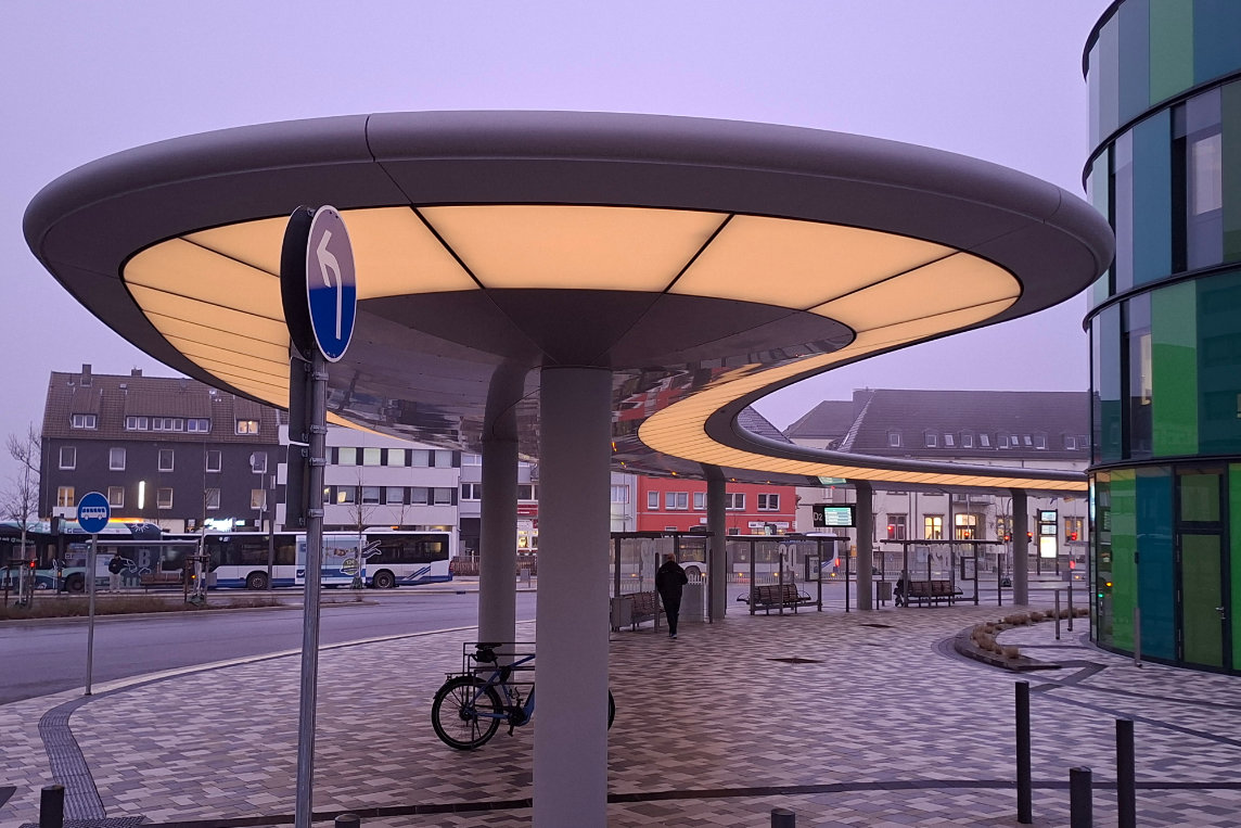 (2.4.2026) Die Überdachung am neuen Zentralen Omnibusbahnhof (ZOB) am Friedrich-Ebert-Platz in Remscheid ist mehr als nur ein Wetterschutz für all jene, die dort auf den Bus warten. Diese beleuchtete Haltestelle, aufgrund ihrer Form auch „Hockeyschläger” genannt, ist aus Sicht der Stadtplaner ein wichtiger Anker zur Belebung des öffentlichen Raums. Nicht zuletzt die Illuminierung des 900 m² großen Baukörpers soll erheblich zu mehr Aufenthaltsqualität beitragen und gerade nachts ein Zeichen großstädtischen Flairs setzen.