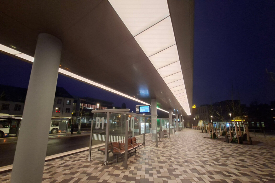 Maßgeschneiderte LEDs der Emslicht AG schaffen einen Ort der Sicherheit und Vitalität im Zentrum Remscheids. Das Unternehmen hat insgesamt 236 maßgeschneiderte LED-Leuchten gefertigt und verbaut. Das geschwungene Haltestellendach überspannt 130 m und ruht auf einem 80 Tonnen schweren Stahlgerüst. Es gliedert den Platz in zwei Funktionsbereiche: Busbahnhof auf der einen, öffentlicher Aufenthaltsraum auf der anderen Seite.