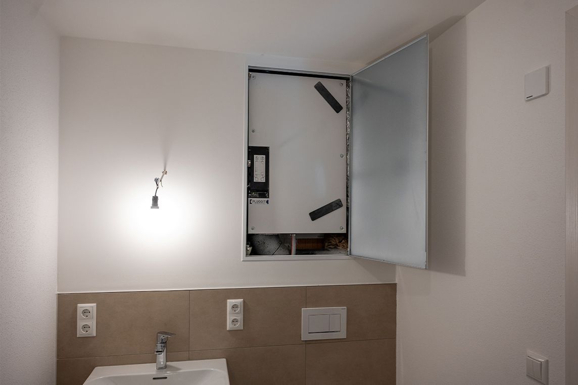 Für kleinere und mittlere Wohneinheiten kam das einheitszentrale System PluggPlan von Pluggit zum Einsatz. Die energieeffizienten Geräte lassen sich platzsparend per Vorwandinstallation im WC integrieren. Jede Wohnung erhielt so ein eigenes System, zugänglich über eine Revisionsklappe. Die Luftverteilung sowie die Außenwandgitter sind individuell anpassbar.