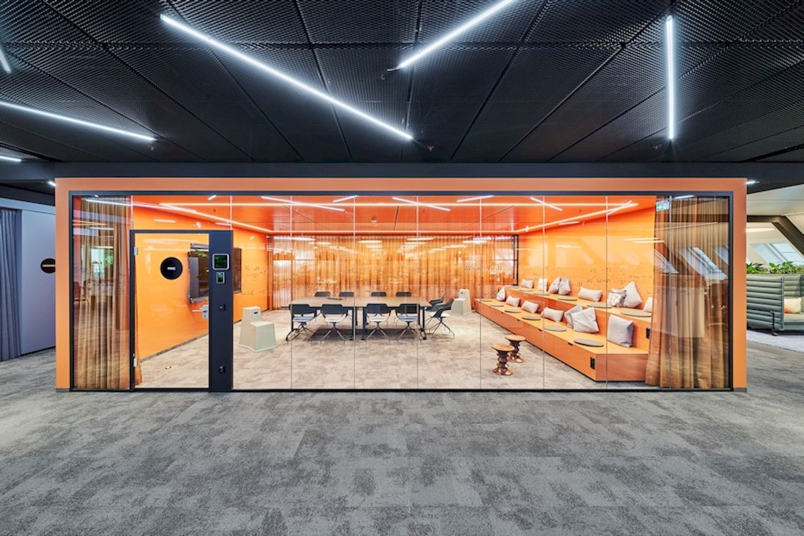 Im Neubau werden die bestehenden Gebäudeteile über einen zentralen Empfang verbunden. Ergänzt wurden Büroflächen sowie Aufenthalts- und Erholungsbereiche. Das Gestaltungskonzept basiert auf einem dualen Prinzip aus warmen und kalten Gestaltungselementen. „Die warme Seite wird durch die Farbgebung Orange, runde Formen sowie Leuchten mit warmen Lichtfarben repräsentiert”, so Simone Wörner. „Im Kontrast dazu steht die kalte blaue Seite, die durch lineare Elemente sowie Kaltlicht-Leuchten charakterisiert ist.”