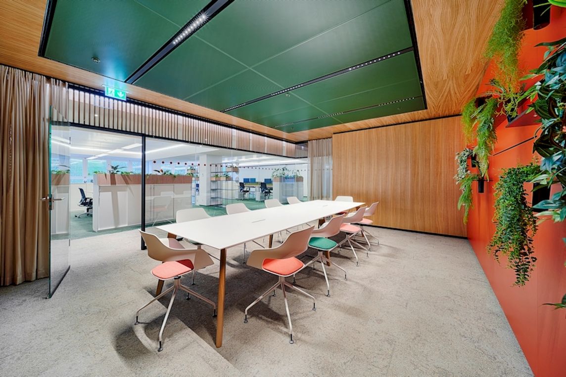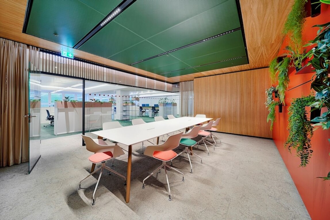 In Büro- und Besprechungsräumen kamen Indul-Schlitzdurchlässe zum Einsatz. Die Durchlassprofile sind ab einer Einbaubreite von 15 mm ausgeführt und lassen sich in unterschiedliche Deckensysteme integrieren – darunter Gipskartondecken, Metalldecken, Streckmetalldecken sowie offene Rasterdecken. Je nach Einbausituation wurden Halshöhen bis 170 mm realisiert, um Kollisionen mit anderen Gewerken zu vermeiden. Ergänzend wurden Blindelemente zur Abluftüberströmung eingesetzt und teilweise mit Bohrungen für die Integration von Pendelleuchten angepasst.