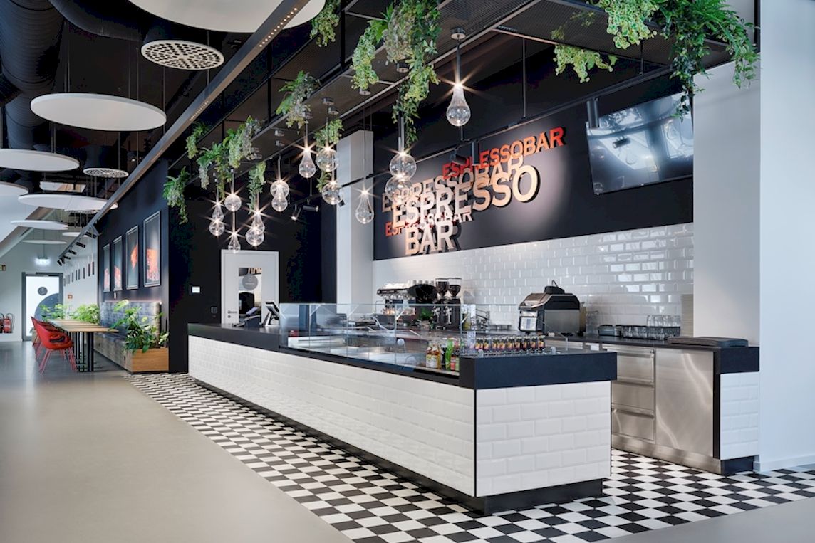 In Bereichen mit hohen Luftwechselraten – etwa Restaurant und Espressobar – wurde der Decken-Luftdurchlass Indudrall eingesetzt. Dieser erzeugt fächerförmige Luftstrahlen und ermöglicht eine schnelle Durchmischung der Raumluft. Auch hier können Temperaturdifferenzen von bis zu -12 K zwischen Zu- und Raumluft ausgeglichen werden. Aufgrund des hohen Induktionsverhältnisses ist eine Montage auch ohne abgehängte Decke möglich, etwa als Sichtinstallation in offenen Deckenkonzepten.