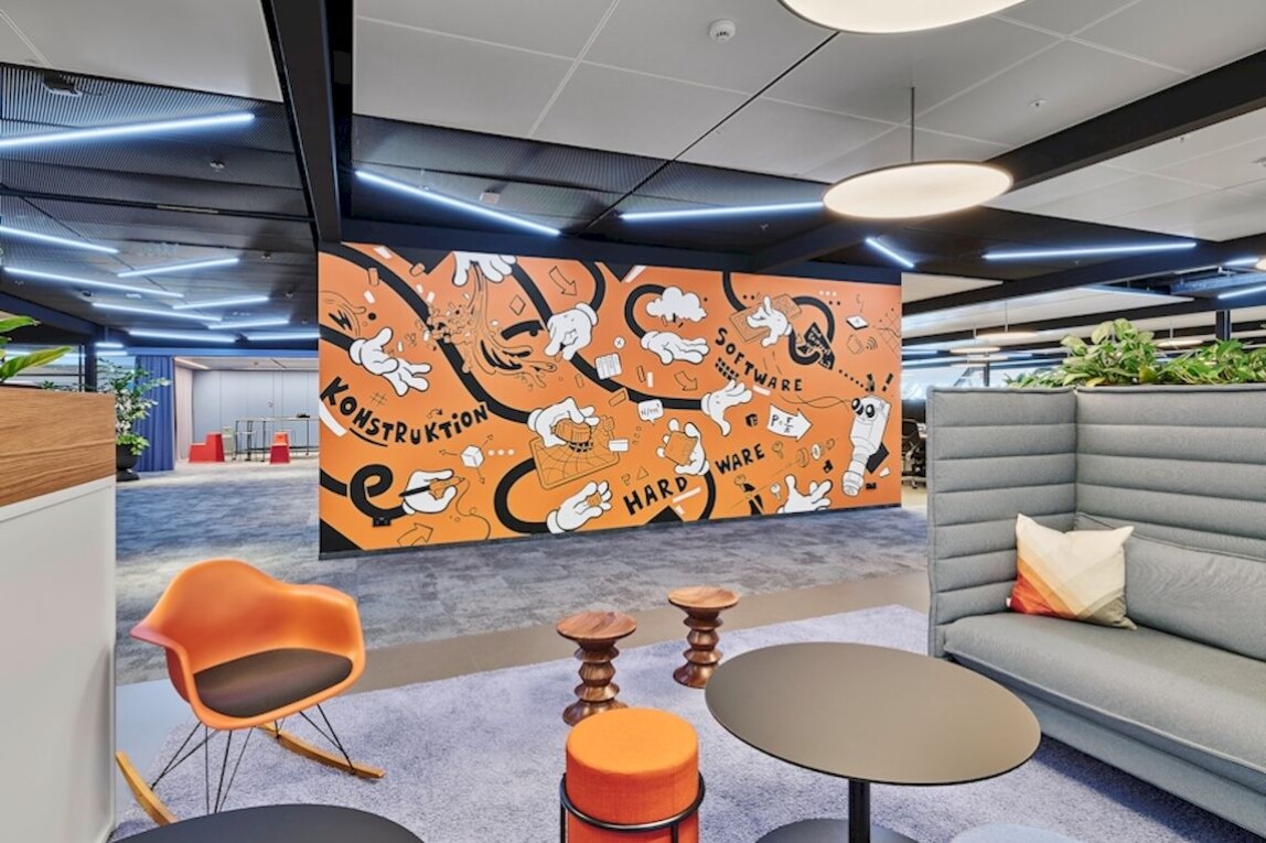 Die Nutzung der Flächen variiert je nach Bereich deutlich. Während die Entwicklung spezielle Elektronikarbeitsplätze und Werkstätten benötigt, wurde der internationale Vertrieb mit einem naturbezogenen Gestaltungskonzept umgesetzt. Farben, Materialien und Formen greifen jeweils die Arbeitsweisen der Nutzer auf.