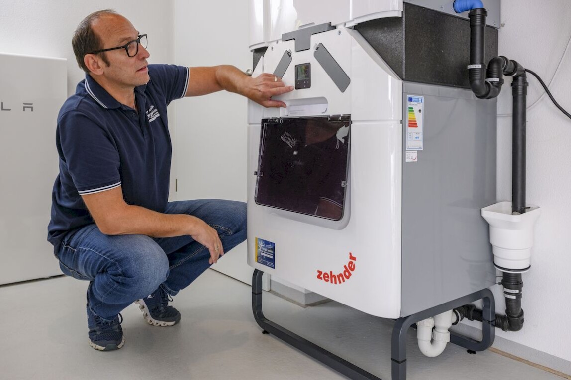 „Als Allergiker lege ich großen Wert auf gute Wohnraumluft. Ein Lüftungsgerät mit integrierten Pollen- oder Aktivkohlefiltern verhindert, dass Schadstoffe und unangenehme Gerüche der nahen Landwirtschaft in den Wohnbereich gelangen. Das hilft mir sehr und reduziert spürbar meine allergiebedingten Beschwerden – Zuhause kann ich Durchatmen.” Das Lüftungsgerät im Keller versorgt die Räume über ein in der Decke integriertes Luftverteilsystem kontinuierlich mit Frischluft und führt verbrauchte Luft nach außen ab. „Zehnder überzeugte uns in erster Linie mit seinem Enthalpietauscher, welcher bis zu 95 % der in der Abluft enthaltenen Wärme zurückgewinnt und zusätzlich die Raumluftfeuchte angenehm reguliert.”