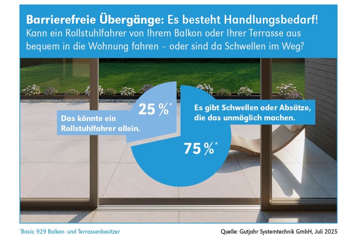 (15.04.2026) Barrierefreie Übergänge gehören im Neubau zunehmend zum Standard, im Gebäudebestand sind jedoch häufig noch erhöhte Türschwellen vorhanden. Diese entstehen meist durch ältere Bau- und Abdichtungsstandards und stellen weiterhin eine verbreitete bauliche Situation dar. Laut einer Umfrage im Auftrag der Gutjahr Systemtechnik GmbH verfügen ~ 75 % der Balkon- und Terrassenbesitzer über solche Schwellen.