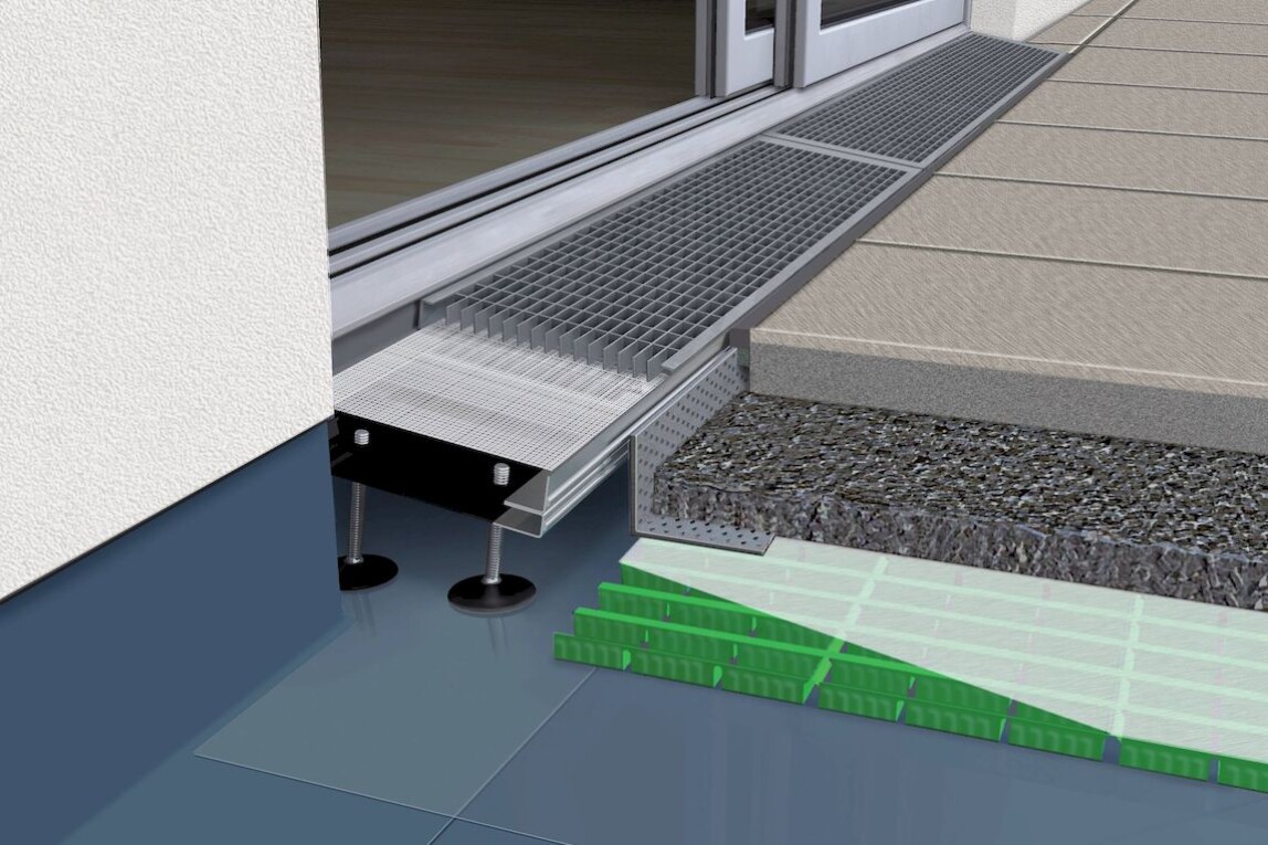 Für diese Anforderungen wird unter anderem ein Komplettsystem aus Spezialdrainrost und Flächendrainage eingesetzt, beispielsweise das System AquaDrain BF-Flex der Gutjahr Systemtechnik GmbH. Der nach unten offene Drainrost ermöglicht eine direkte und rückstaufreie Wasserabführung im Türanschlussbereich. In Kombination mit der Flächendrainage wird das Wasser gezielt vom Gebäude weggeleitet.