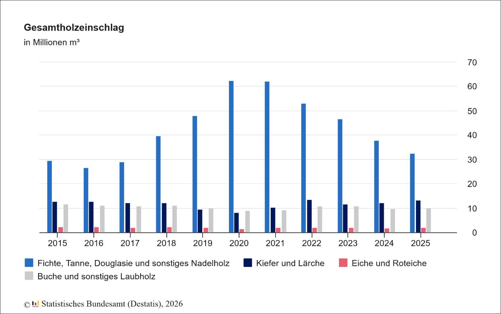 Insgesamt wurden 32,4 Mio. m³ Holz der Holzartengruppe „Fichte, Tanne Douglasie und sonstiges Nadelholz” im Jahr 2025 eingeschlagen. Dies bedeutet einen Rückgang um 14,3 % gegenüber dem Vorjahr (2024: 37,7 Mio. m³) sowie 48 % gegenüber dem auch für diese Holzartengruppe bedeutendsten Einschlagjahr 2020. Fichtenholz bleibt dennoch die am häufigsten verfügbare Holzart. Mit deutlichem Abstand folgen Kiefern- und Lärchenholz mit 13,2 Mio. eingeschlagenen m³ sowie Holz der Holzartengruppe „Buche und sonstiges Laubholz” mit 9,9 Mio. m³; an Eichen- und Roteichenholz waren es 1,9 Mio. m³.