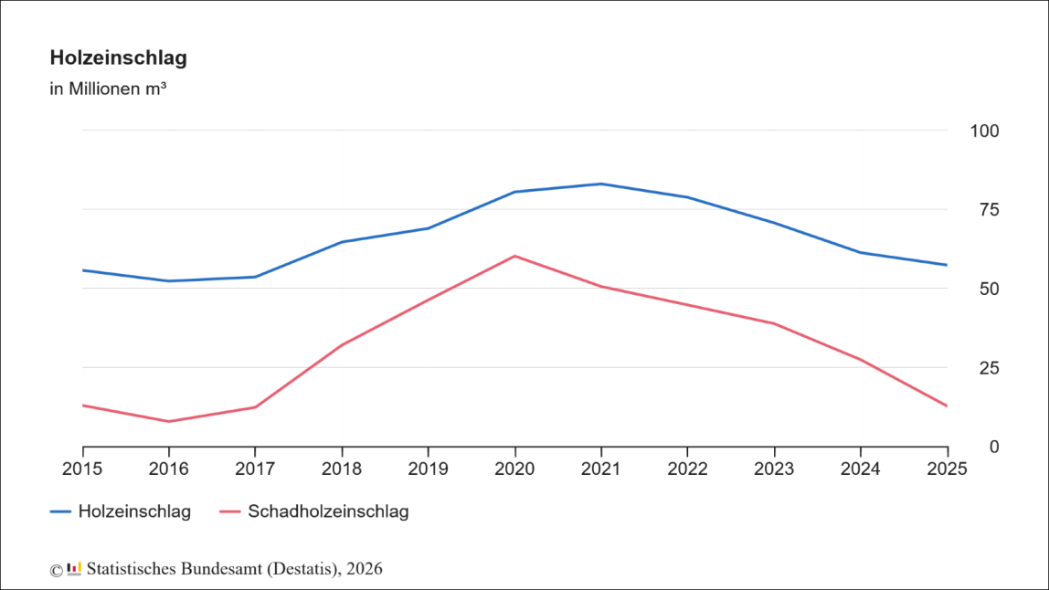 Holzeinschlag 2025 insgesamt gesunken, Schadholzaufkommen halbiert