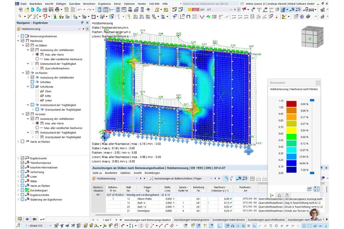 Die Zuweisung erfolgt über die Balkenscheibe; nachgewiesen werden die enthaltenen Stäbe, Beplankungen und Verbindungsmittel. Auslastungsergebnisse sind grafisch, in Detailnachweisen und als Ergebnisverläufe darstellbar.