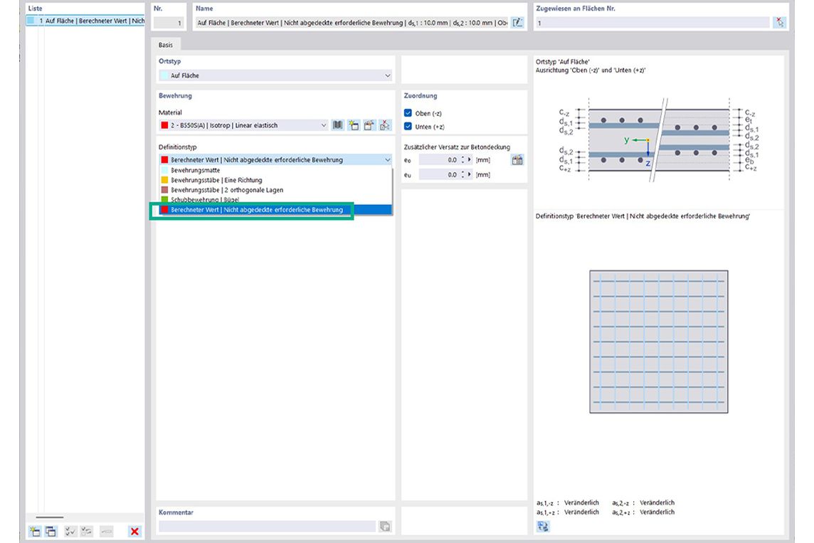 Im Add-On Betonbemessung kann vorhandene Bewehrung für die Flächenbemessung schnell über den Typ „Berechneter Wert / Nicht abgedeckte erforderliche Bewehrung” ermittelt werden. Die erforderliche Bewehrung wird aus der Tragfähigkeitsbemessung abgeleitet; lediglich der Stabdurchmesser ist manuell vorzugeben.