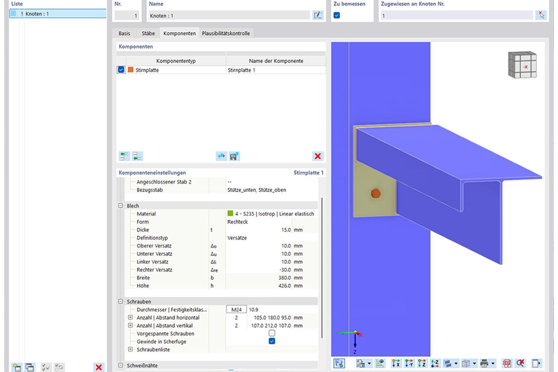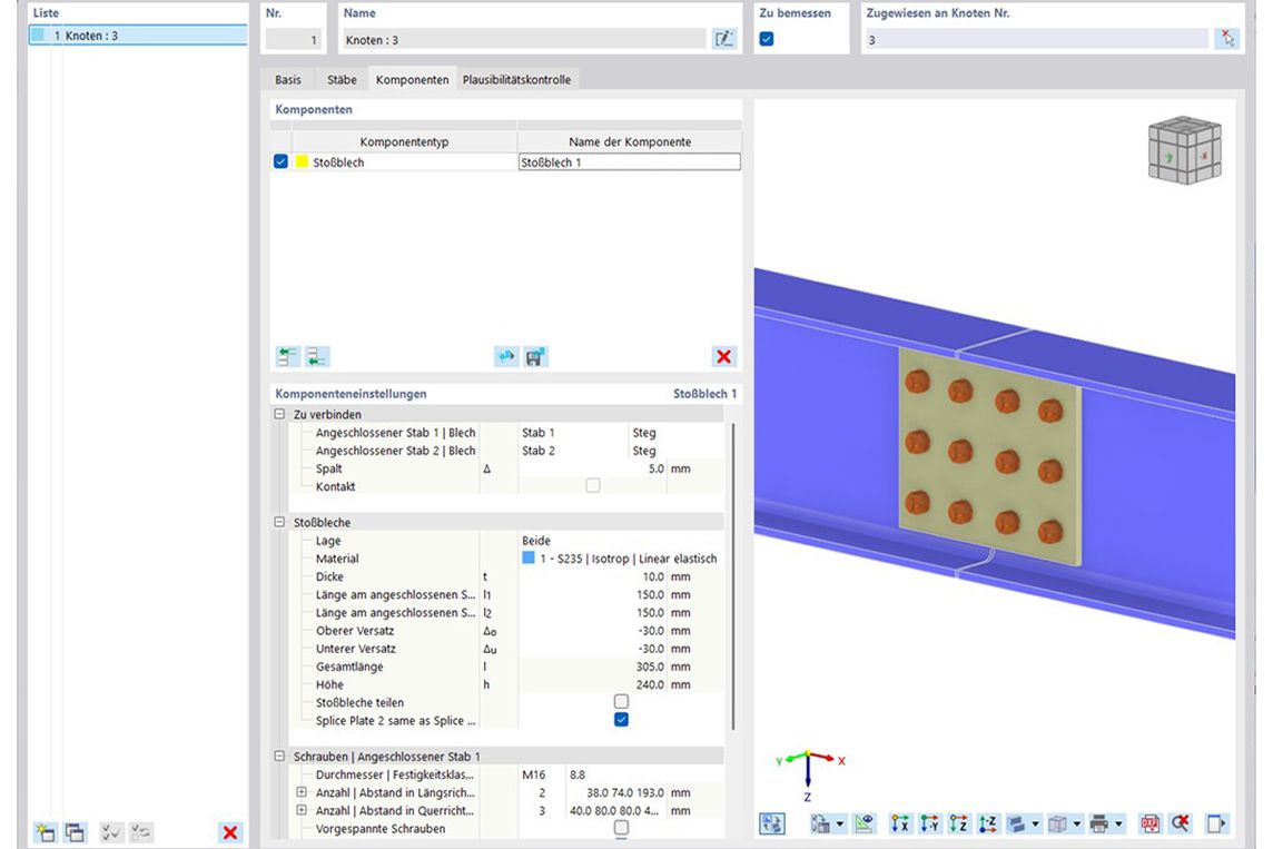Mit der Komponente Stoßblech lassen sich im Add-On Stahlanschlüsse geschraubte Verbindungslaschen und ähnliche Anschlüsse unkompliziert erstellen.