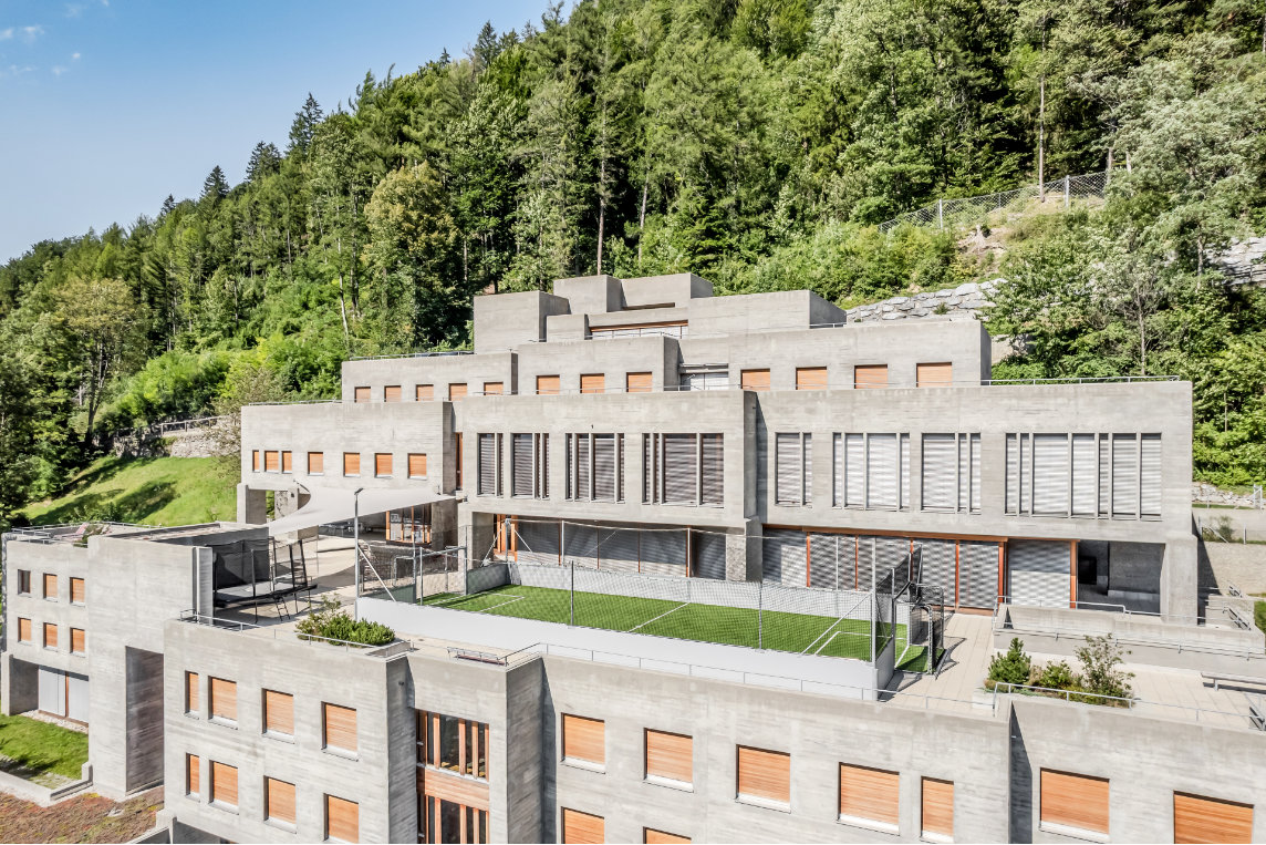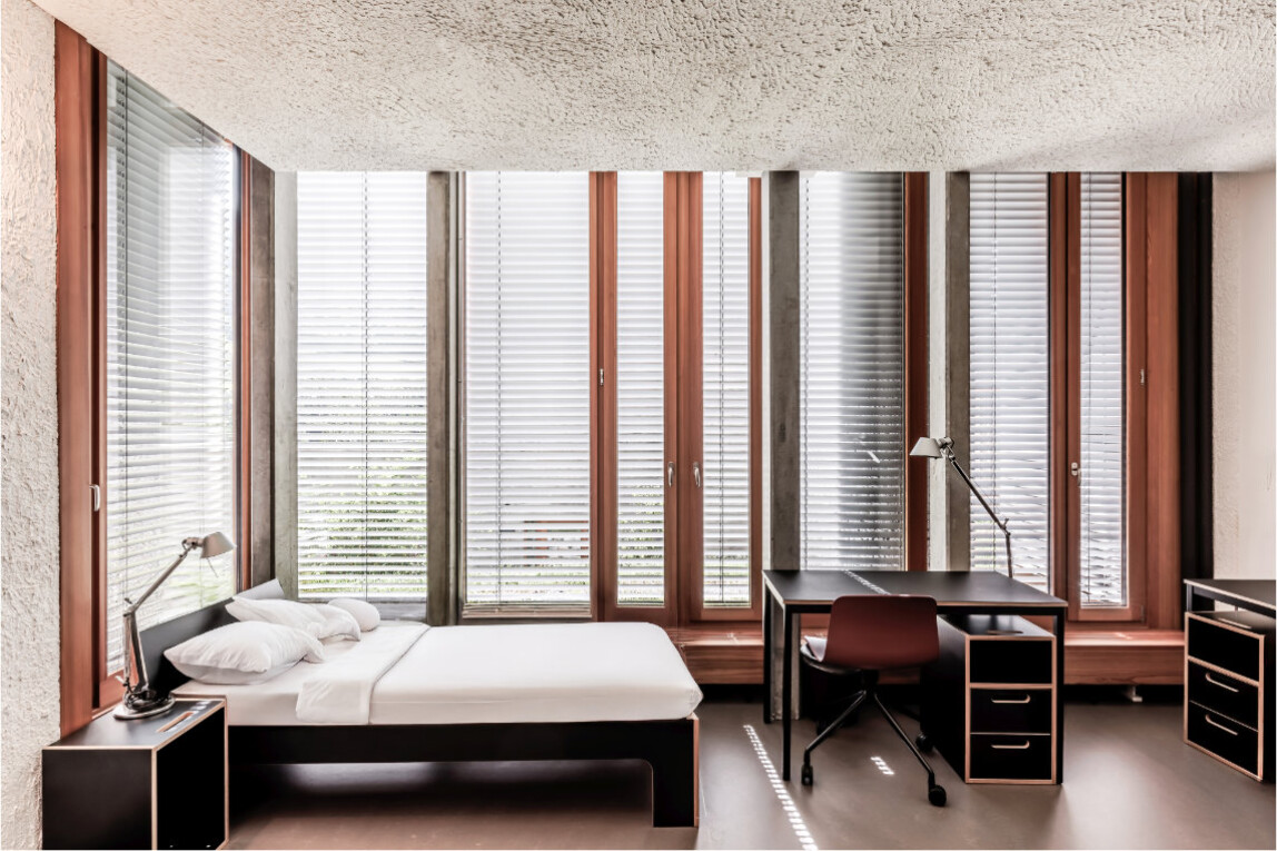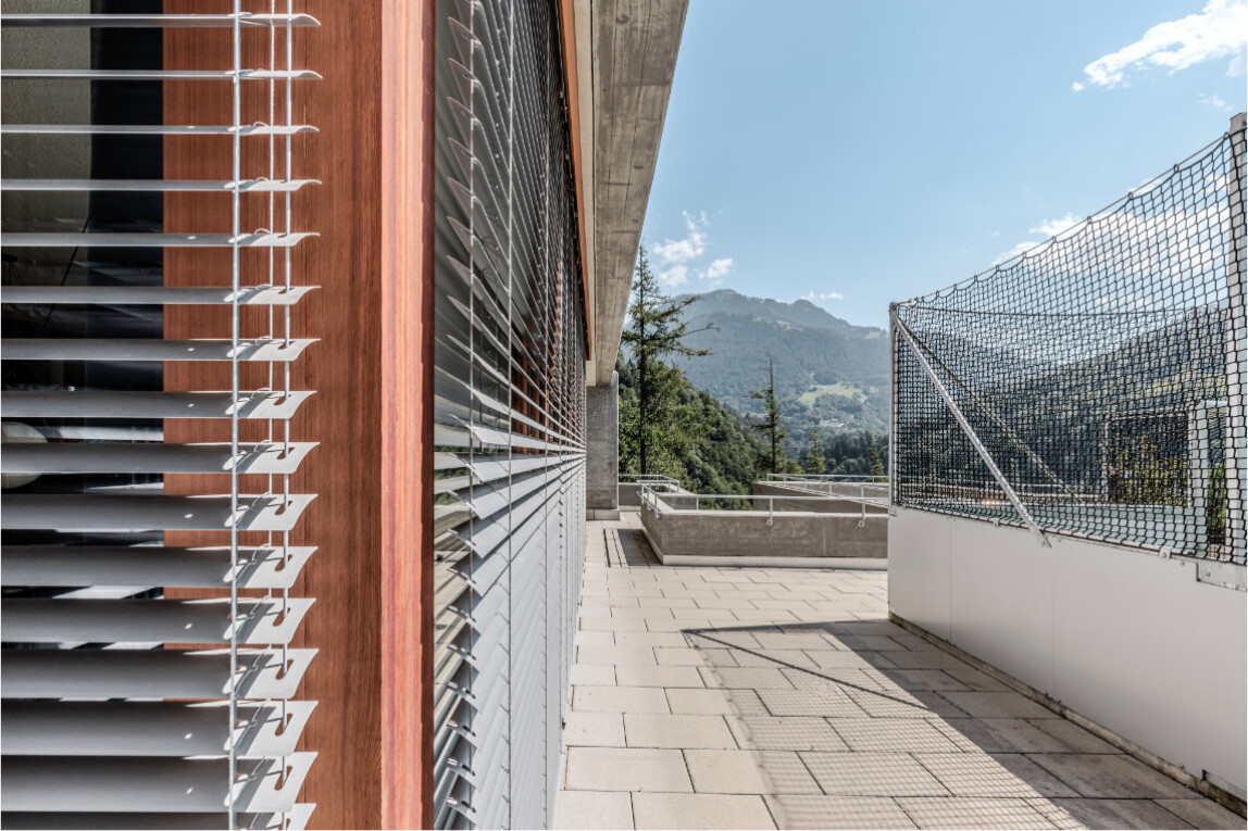 Für den Sonnenschutz wurden Griesser Lamellenstoren Aluflex gewählt. Die flachen, flexiblen Lamellen fügen sich in den Fassadenrhythmus ein, ohne das Erscheinungsbild zu überlagern. In den Wohn- und Lernräumen ermöglichen sie präzise Tageslichtsteuerung und wirksamen Blendschutz; automatisierte Systeme tragen zudem zur Senkung des Energiebedarfs bei.