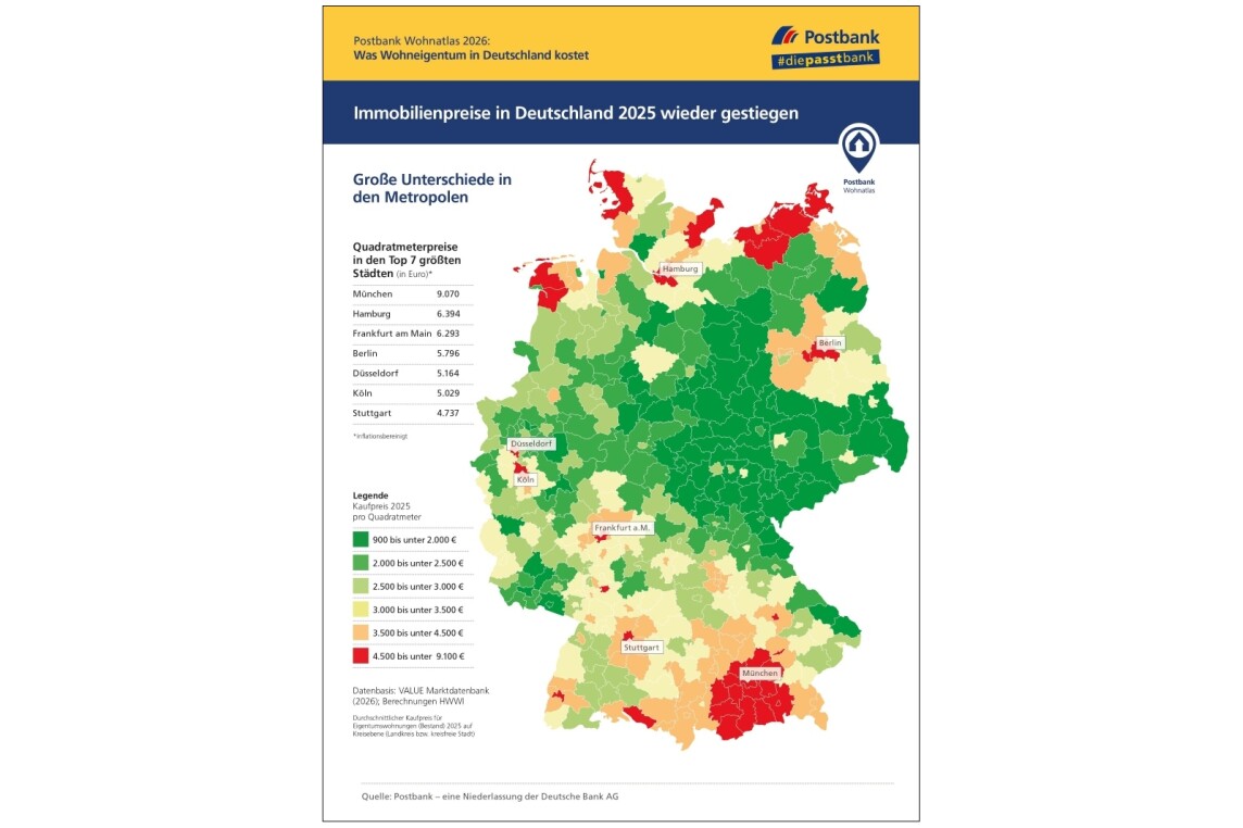 Postbank Wohnatlas 2026: Immobilienpreise 2025 wieder gestiegen