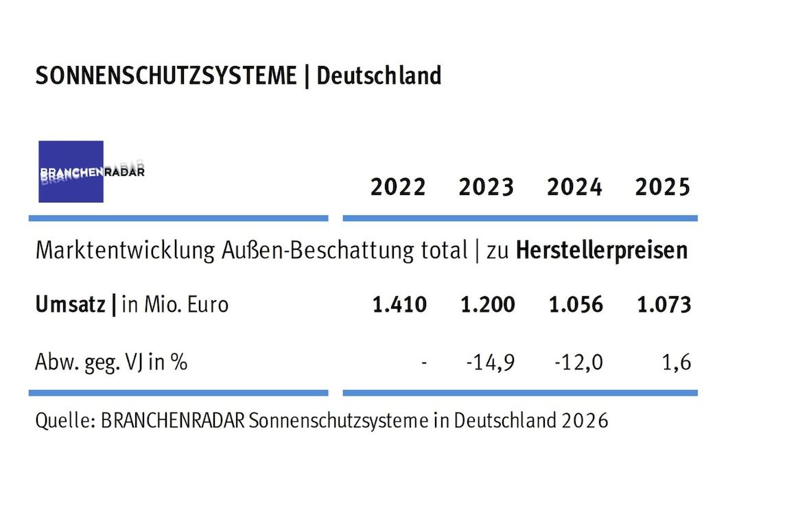 (21.04.2026) Der Markt für außenliegenden Sonnenschutz in Deutschland hat sich 2025 erlösseitig stabilisiert. Laut Branchenradar stieg der Herstellerumsatz um 1,6 % gegenüber dem Vorjahr auf 1,07 Mrd. Euro. Die Nachfrage ging im gleichen Zeitraum um 1,2 % zurück. In den beiden Vorjahren hatte der Markt rund 30 % seines Volumens verloren. Vor diesem Hintergrund wird die Entwicklung im Jahr 2025 als Stabilisierung bewertet.