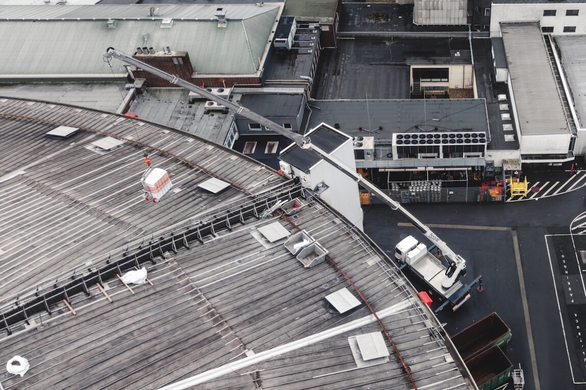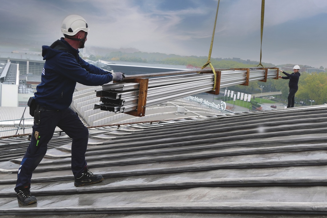 Anschließend hob der AK 48 Bitumenbahnen und Kalzip-Aluminiumprofile für den neuen Dachaufbau auf eine Dachkantenhöhe von rund 20 m. Insgesamt werden im Verlauf der Sanierung etwa 5 t Leistendeckung, rund 28 t Steinwolle sowie die komplette Holzunterkonstruktion bewegt. Der neue Dachaufbau besteht aus einer Sicherheitsabdichtung, einer Dampfsperre, einer mehrlagigen Wärmedämmung und der abschließenden Kalzip-Aluminiumdeckung.