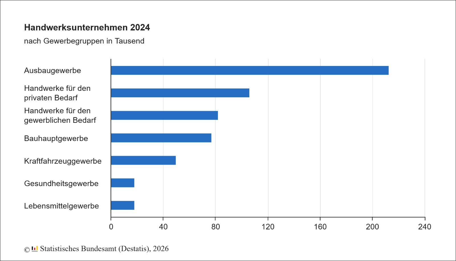 Besondere Bedeutung hat das Handwerk im Baugewerbe: Im Jahr 2024 waren 65,2 % aller Unternehmen in diesem Wirtschaftszweig Handwerksunternehmen. Die weitaus größte Gewerbegruppe innerhalb des Baugewerbes und des Handwerks insgesamt – sowohl bezogen auf die Zahl der Unternehmen als auch die tätigen Personen sowie den Umsatz – ist das Ausbaugewerbe.
