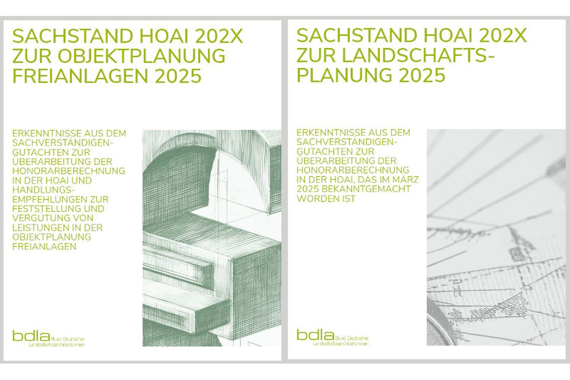 Die Broschüre „Sachstand HOAI 202X zur Objektplanung Freianlagen 2025” wurde von Dieter Herrchen und Mirjam Mohrlüder erarbeitet. Die Broschüre „Sachstand HOAI 202X zur Landschaftsplanung 2025” stammt von Dieter Pfrommer und Martin Janotta.