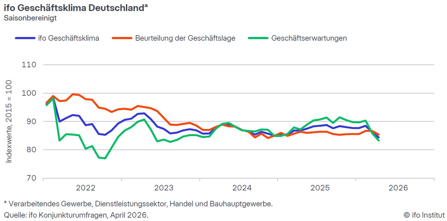 (24.04.2026) Der ifo Geschäftsklimaindex sank im April 2026 auf 84.4 Punkte, nach 86,3 Punkten im Vormonat. Der niedrigste Wert seit Mai 2020. Die Unternehmen blicken erheblich pessimistischer auf die kommenden Monate. Die geopolitischen Krisen treffen die deutsche Wirtschaft hart.