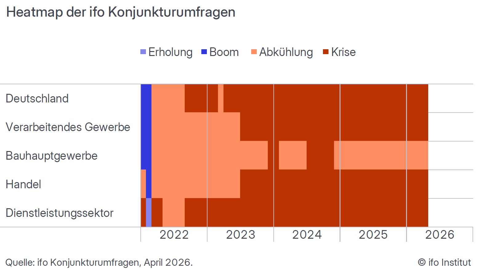 Die ifo-Heatmap bietet eine verdichtete Darstellung der ifo-Konjunkturuhr für die verschiedenen Branchen. Dunkelrot markiert eine unterdurchschnittliche Lage und Erwartung – ein Krisensignal. Hellblau steht für Erholung, dunkelblau für Boom- oder Überhitzungsphasen. Ein hellroter Farbton weist hingegen auf eine Abkühlung mit sinkenden Erwartungen hin.