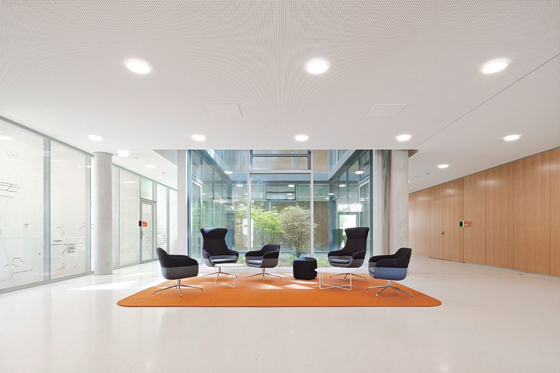 Das zweischalig aufgebaute System 2300 (Wandstärke 125 mm) trennt die Bereiche auf den Büroetagen. Es überzeugt mit flächenbündiger Verglasung, hoher Transparenz und Leichtigkeit sowie einem Schallschutzwert von Rw,P 51 dB. Zahlreiche raumhohe Ganzglasecken, ausgeführt in diesem System, schaffen fließende Übergänge, lassen Tageslicht tief ins Gebäude eindringen und unterstreichen die offene Atmosphäre.